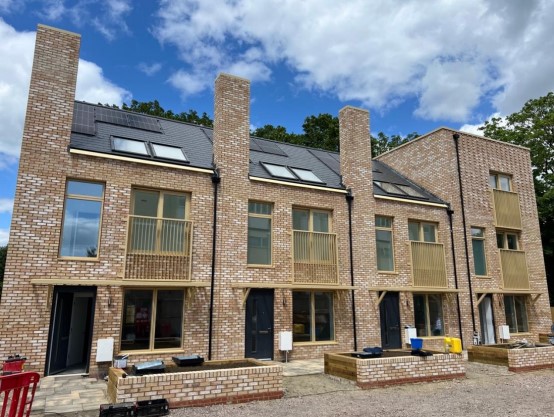 The project is an infill site onto an original residential garage block to construct 4 houses, three terrace of two storey two bedroom houses and one three storey HMO with 4 bedrooms and bathrooms for critical care workers. The building is traditional foundation, brick and block façade, pitched roof and flat roof structures with high energy efficiency performance.
